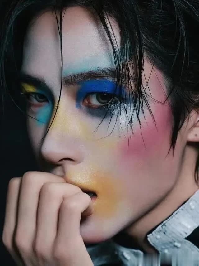 那抹油彩妆堪称 “灵魂暴击”!它可不是简单的颜料涂鸦,而是从眼尾延伸至下颌的渐变效果,冷调的银灰中掺杂着些许碎钻闪,在镜头下宛如结了一层未来感的冰。他低头整理高珠项链时,油彩的棱角恰好与下颌线重合,没有 “花妆” 的杂乱之感,反倒像是戴了一副 “灵魂面具”——